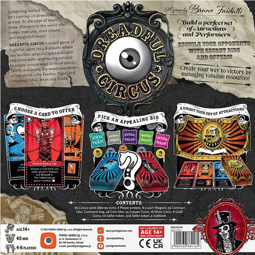 Dreadful Circus is a set collection game in which you're trying to create the most successful circus! The game comes with a unique twist - over the course of the game players are buying cards that have unique final scoring rules. As the game progresses, and more and more cards are gained, each player has developed their very own final scoring rules. No game is the same, no player at the table scores the same way. It's a unique concept in which players, over the number of rounds build the way they will score at the end. Dreadful Circus is designed by industry icon Bruno Faidutti, is for 4-8 players, and plays in 30-40 minutes. The game is an extremely clever card game for gamers.