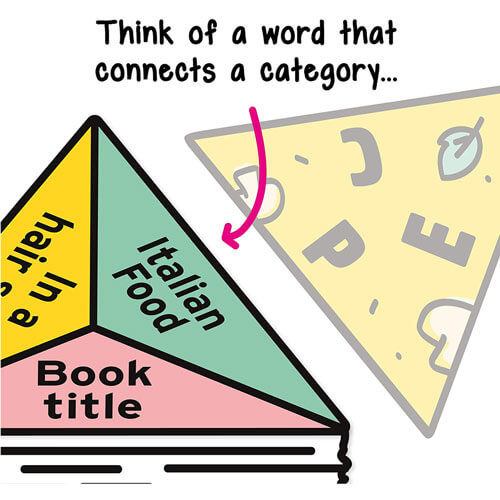 The aim of the game is to build your giant slice of pizza by winning small triangles of pizza. To win a triangle you must be the first player to shout out a word that links the category and the letter on the cards. So if the letter is B and the category is TV Shows, you could shout Baywatch!. If you're first to shout a correct answer, you win the card. Now flip a new card and go again. Each round there are three letters and three categories on the table, so you can link any letter to any category. You just need to be super quick!