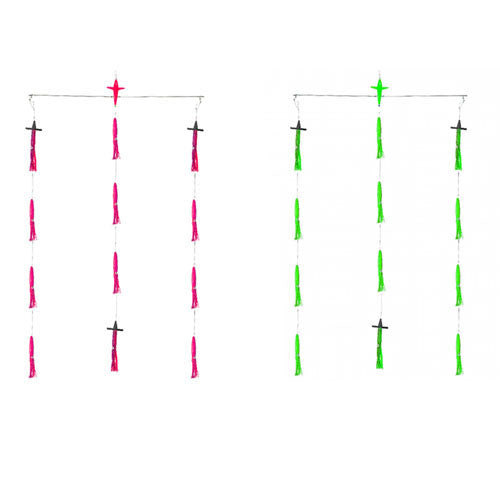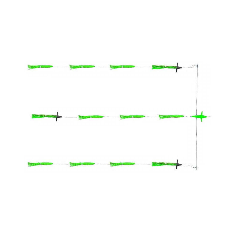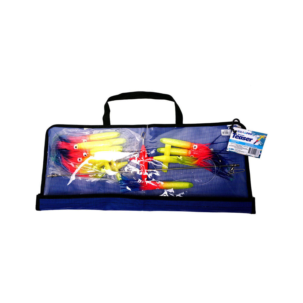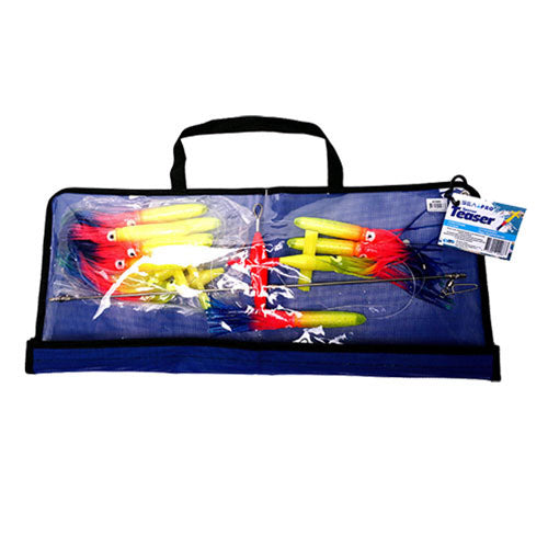 Features a 600 mm Stainless Steel Spreader bar with a 140 mm (5 inch) Humminbird Splasher for the ultimate top water attraction in bluewater. The Sparrow Treaser is designed for high water and maximum attraction as the 9 inch high float foam filled squid attractors tailed with a 9 inch matching Humminbird. Includes a mesh storage pouch for easy wash down. 9 X 9inch Hi Vis Squids, 1 X 5 inch Bird, 3 X 9 inch Humminbirds. Rigging: 200 pound Hard core mono.