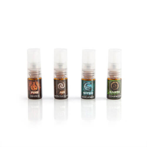 • Mezclas de 4 elementos y aceites esenciales: fuego/naranja, agua/bergamota, aire/limón eucalipto, tierra/madera de cedro.