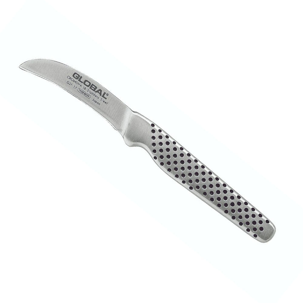 El GSF-17 es un cuchillo con un propósito muy específico; ¡Para pelar y voltear tantas verduras como puedas! La pequeña hoja curva hace que el cuchillo sea práctico para trabajar con objetos esféricos como patatas y manzanas. Hay una pequeña muesca en el mango para proporcionar agarre y control para evitar golpes y ranuras, la hoja afilada atravesará la piel dura de la batata y otros tubérculos.