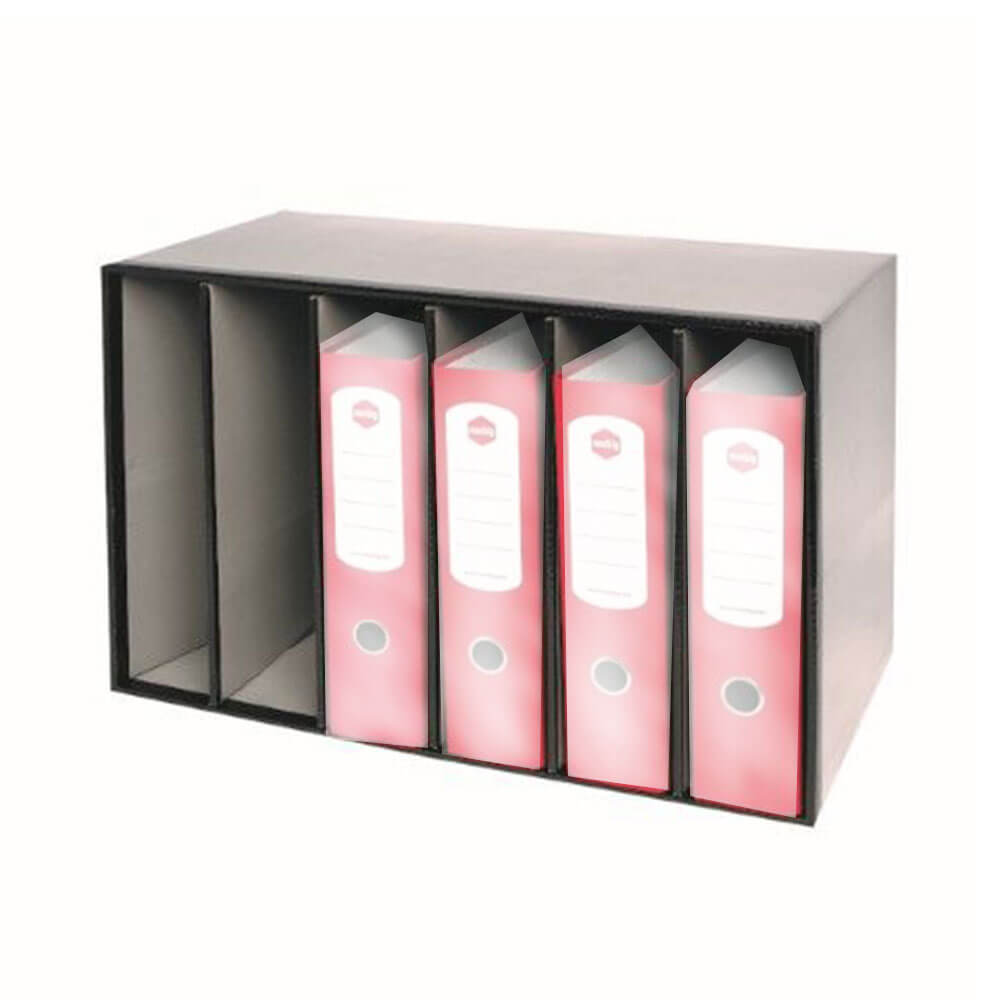 6 compartimentos que se pueden usar para almacenar archivos y carpetas o que se pueden colocar de lado como estantes