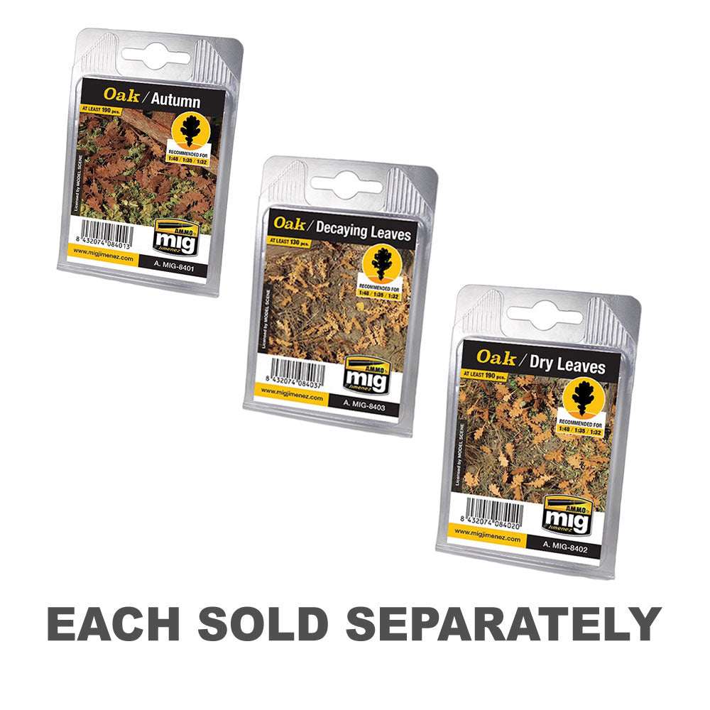 Hojas secas de roble hechas de papel impreso cortado con láser, súper realistas y con mucho detalle. Perfecto para añadir un toque final de realismo a tu diorama, vehículos o figuras. Fácil de pegar con un poco de cola blanca. Su tamaño los hace óptimos para escalas 1:48, 1:35 o 1:32. Cantidad mínima incluida: 190 uds.