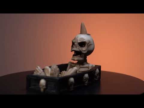 Misterioso quemador de incienso con forma de esqueleto sentado dentro de un ataúd. Coloque un cono de incienso encendido sobre la cabeza del esqueleto para ver el humo salir por su boca. Apto tanto para varitas de incienso como para conos.
