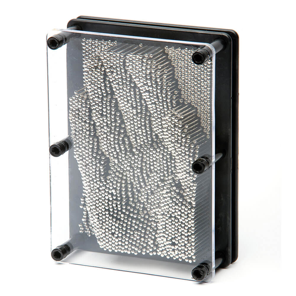Soulevez l'appareil vers votre visage - ou une autre partie appropriée de votre anatomie et appuyez doucement sur les milliers de broches métalliques pour révéler une impression 3D parfaite derrière un panneau Perspex.