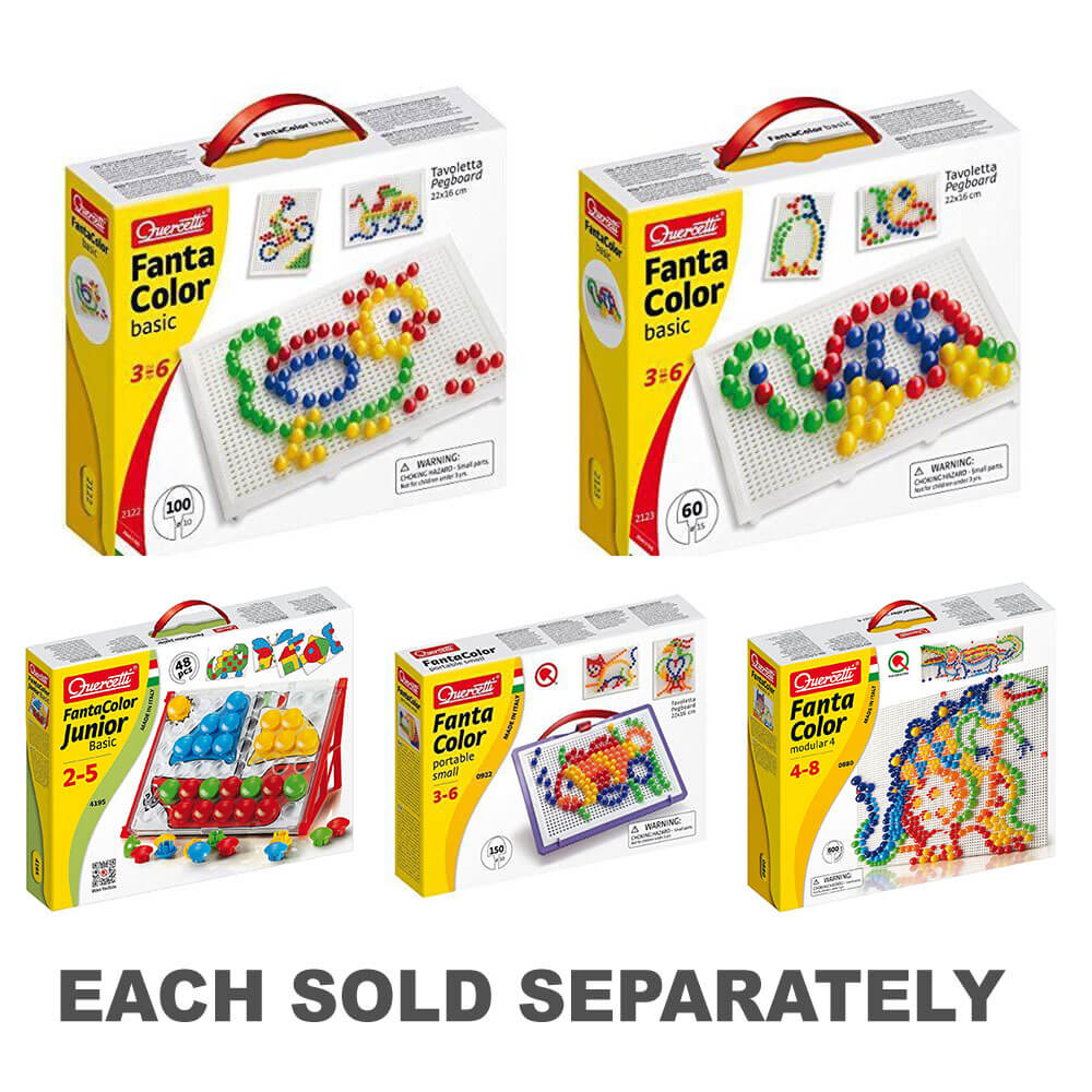 - Fantacolor Basic: âge recommandé 3-6 ans, contient 60 pièces ou 100 pièces en 4 couleurs et 1 panneau perforé. AVERTISSEMENT: étouffement Hazard, ce modèle n'est pas pour les enfants de moins de 3 ans