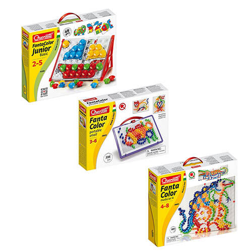 Les enfants plus âgés profiteront d'un panneau perforé légèrement plus difficile avec le Fantacolor Basic ou le Fantacolor Portable. Ces kits ont plus de pièces (60 ou 100) et les enfants peuvent fabriquer des mosaïques plus complexes afin que ces styles soient destinés aux enfants de 3 à 6 ans.