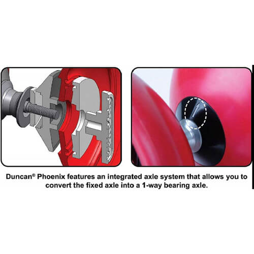 - ROULEMENT INTERCHANGEABLE : Les joueurs de diabolo n'auront plus à choisir entre un diabolo à axe fixe et un diabolo à roulement à sens unique. La conception unique des roulements interchangeables Duncan Phoenix Diabolo vous permet de serrer facilement à la main les boutons du pour basculer les essieux entre fixe et rotatif.