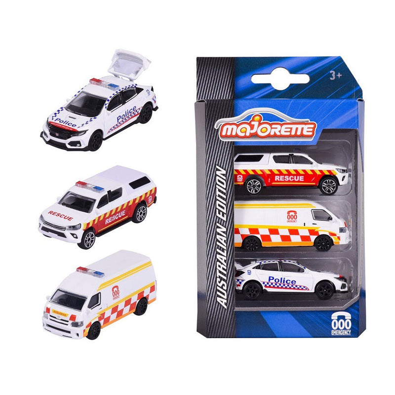 Jouet de véhicule Triple Zero Australian Majorette à partir de matériaux de haute qualité. Ce pack triple exclusif comprend une ambulance Toyota Hiace, un camion de pompiers Toyota Hilux et une voiture de police Honda Civic Type R basée sur les livraisons des services d'urgence du Sud du Sud et couramment vu sur les routes australiennes. Échelle: 1:64. Pas adapté aux enfants de moins de 3 ans. Compagnon de jeu durable.