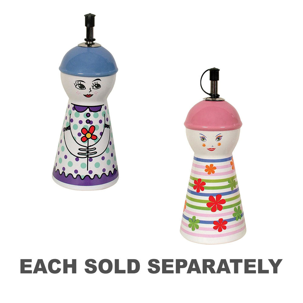 • This sweet pink oil and vinegar bottle featuring a girl in a hat adds a touch of whimsy to your kitchen.