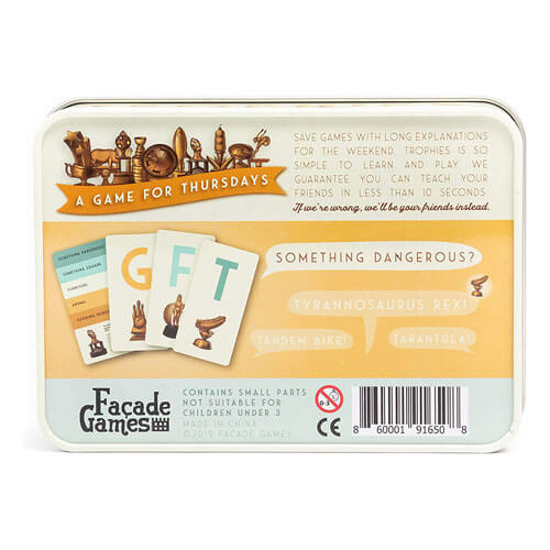 • DÉTAILS : Jouez à ce jeu de 5 à 15 minutes avec 2 à 30 joueurs âgés de 8 ans et plus. Les trophées comprennent 70 cartes trophées uniques, 350 sujets et un tout petit trophée en métal pour le gagnant.