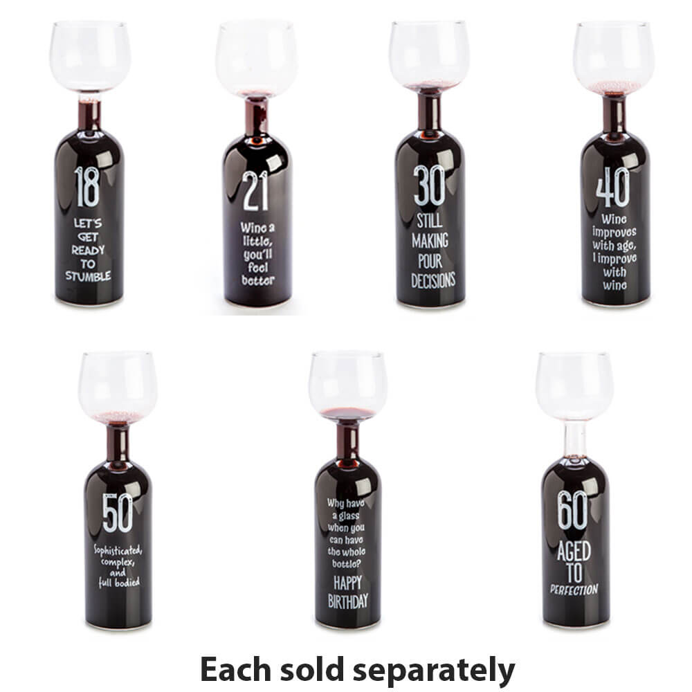 Cette édition de The Wine Bottle Glass propose également plusieurs phrases d'anniversaire pour vraiment ajouter un flair personnel à vos tâches de cadeau - du 18 au 60e messages d'anniversaire personnalisés! Avec une base de bouteille de vin et un verre à vin chic sur le dessus, il est facile et pratique de boire ou même de verser du verre de bouteille de vin de joyeux anniversaire.