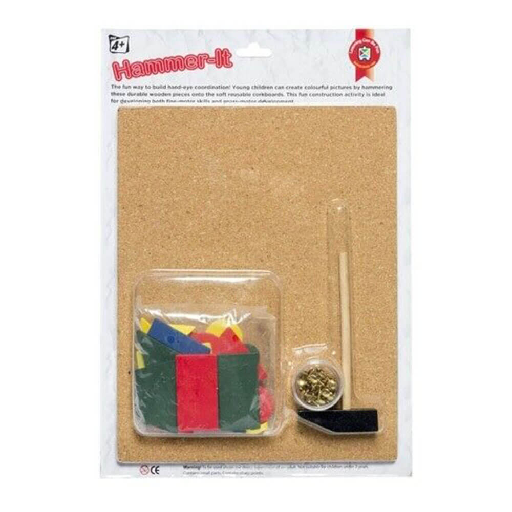 Les jeunes enfants peuvent créer des images colorées en martelant ces pièces de bois aux couleurs vives sur les panneaux de liège souples et réutilisables.