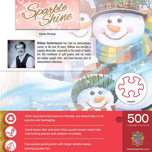 Questi capolavori da 19 "x 19" 500pc per glitter per le vacanze sono il modo perfetto per entrare nello spirito delle vacanze e il regalo di Natale perfetto per amici e familiari. Una famiglia di pupazzi di neve fa un bel ritratto. Questa bellissima opera d'arte è migliorata con uno strato glitter per dargli un tocco extra speciale. Per ridurre il suo impatto sul nostro ambiente, la chipboard utilizzata in questo puzzle è realizzata in materiale riciclato.
