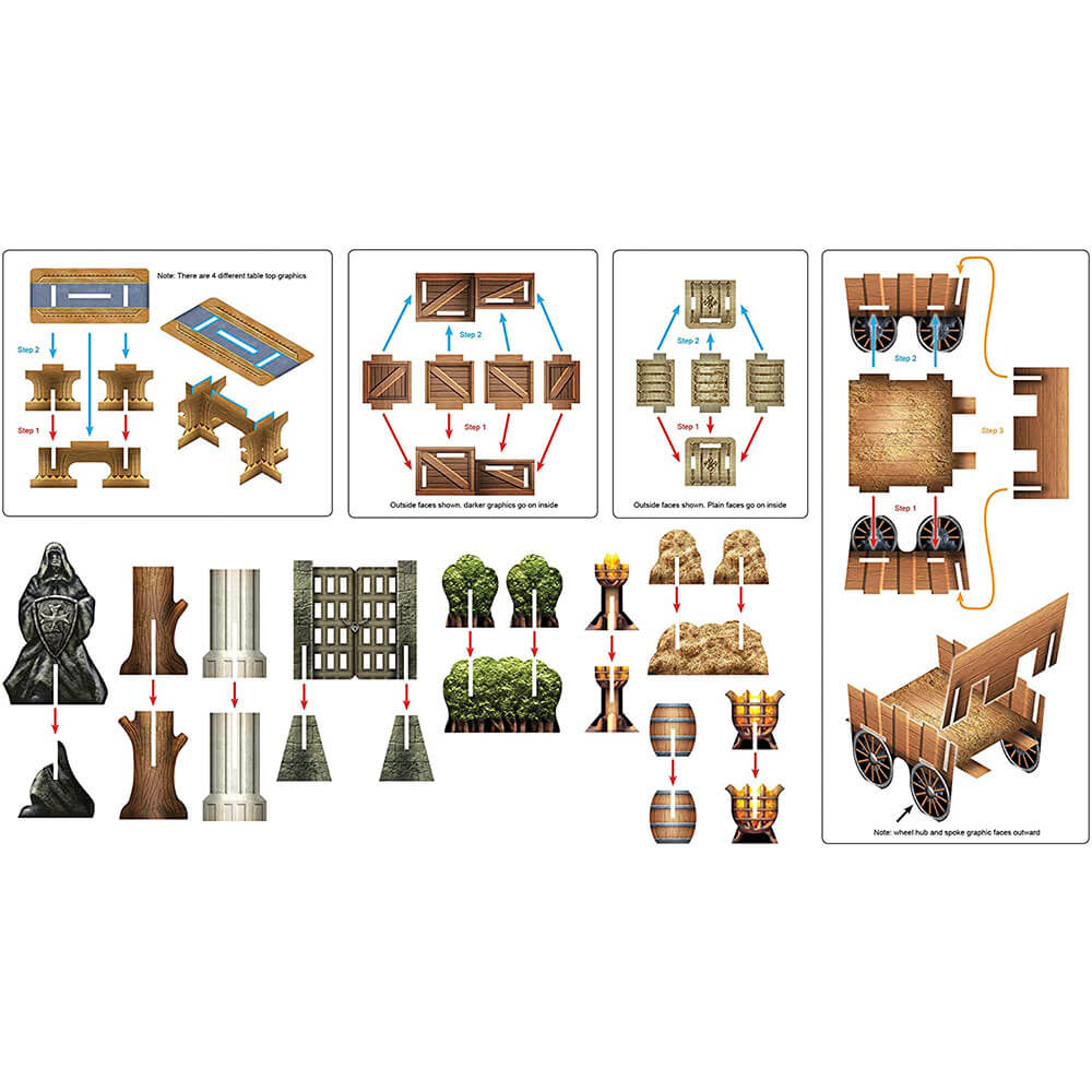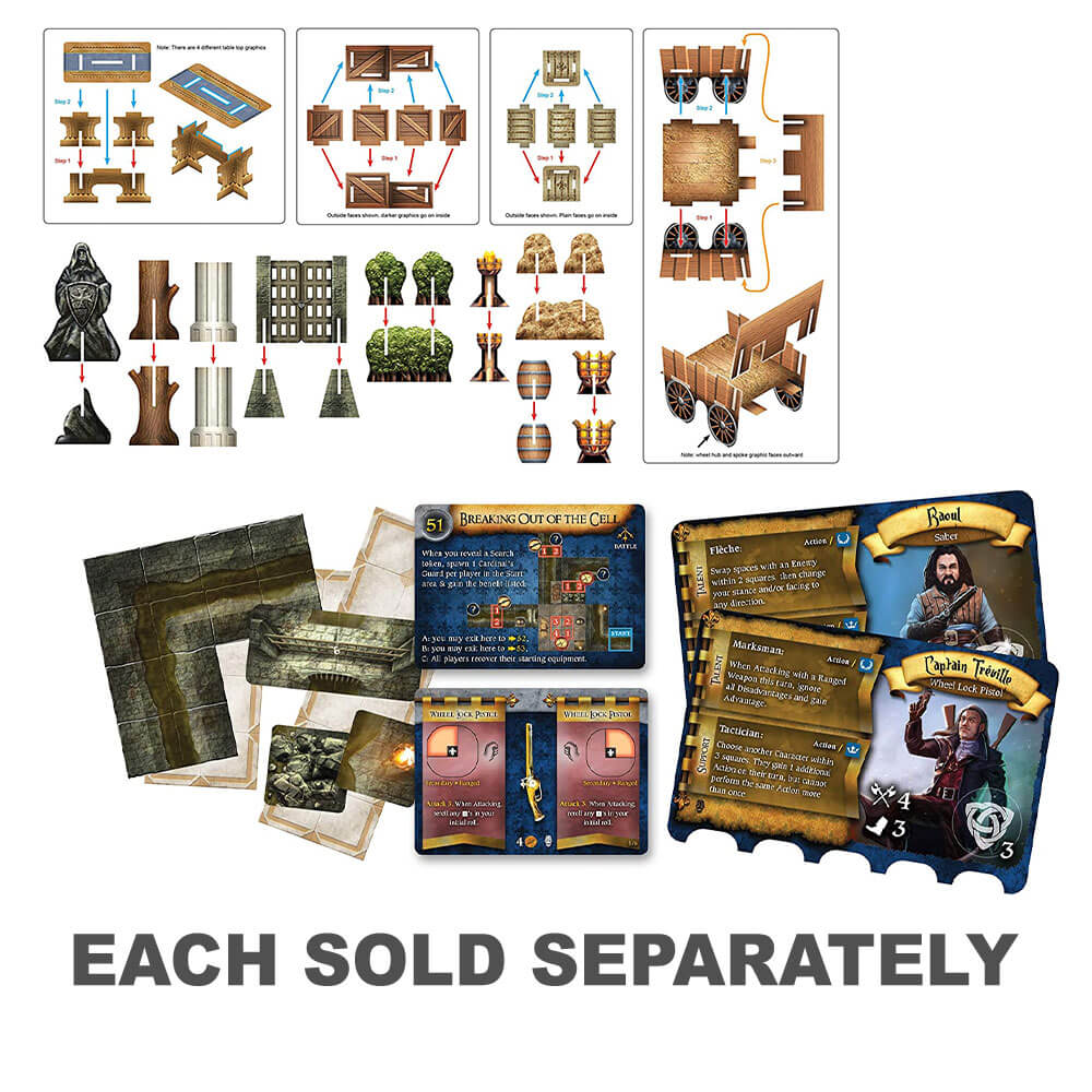 Include oggetti di cartone a slot-together per tutte le piastrelle del terreno utilizzate nell'eredità di Gascony, oltre alle espansioni: The Man in the Iron Mask & the Count of Monte Cristo.