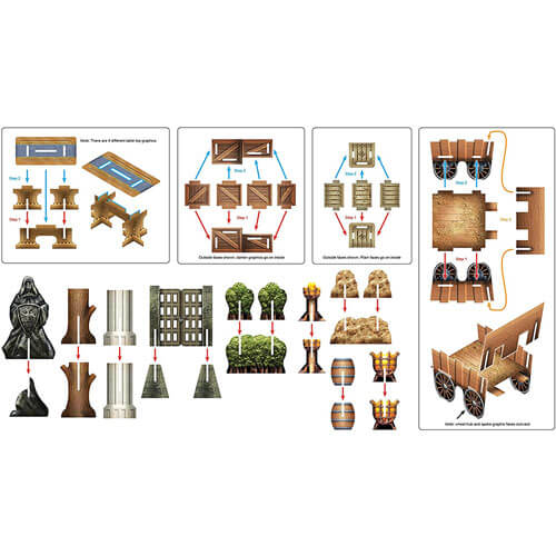 - Il pacchetto conterrà circa 4-5 borse di punch riempite con rapidi ostacoli assemblati che includono (ma non limitati a): barili, piante in vaso, forzieri, mobili (sedie e tavoli), pilastri, rocce e arbusti, porte, fiamme di speranza, e urne di disperazione.