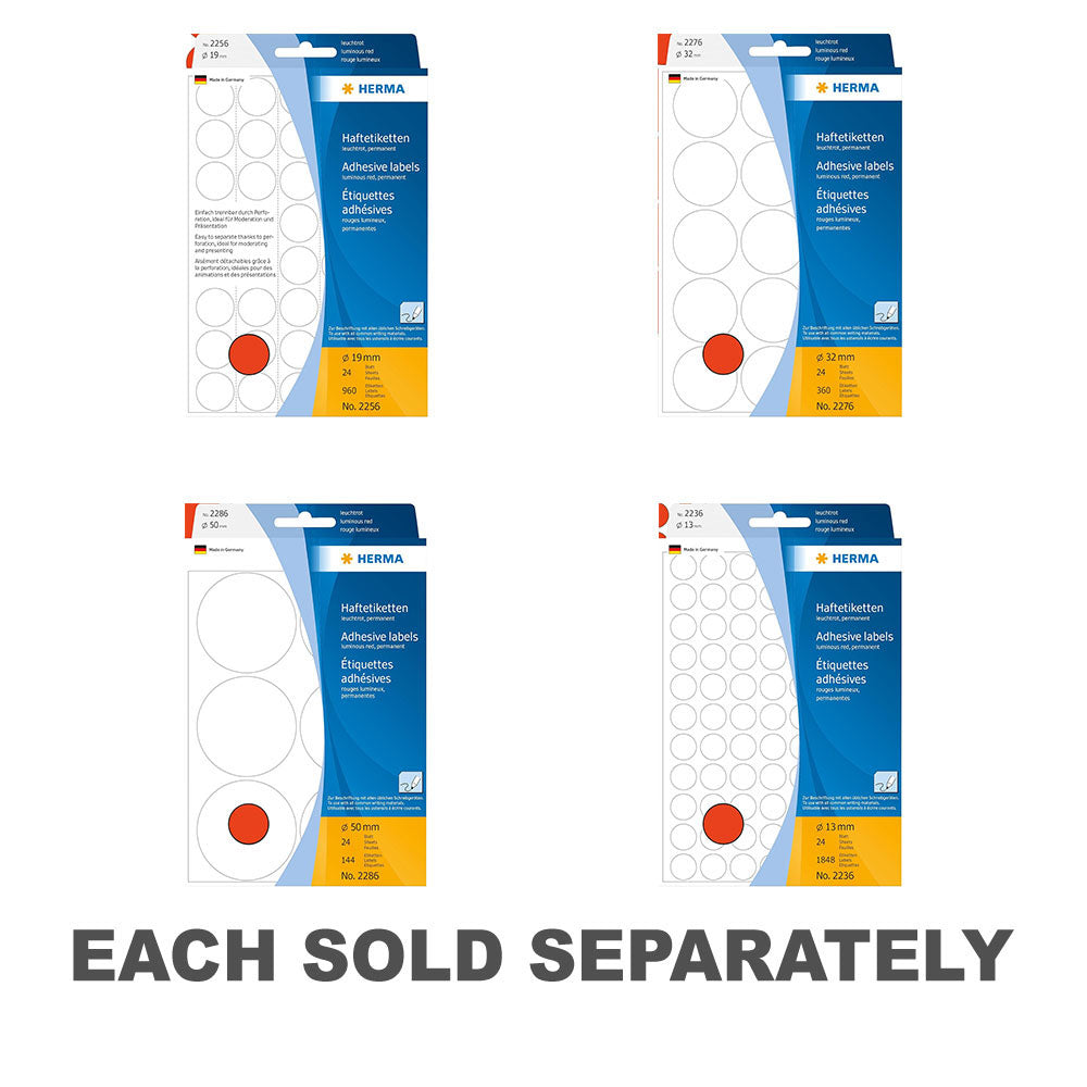 Add a pop of color and illumination to your labeling tasks with Herma Luminous Coloured Dot Labels! This pack includes dot labels in red, featuring a luminous finish for high visibility and impact. Whether for organizing, crafting, or creative projects, these luminous dot labels stand out in low-light conditions or crowded environments, ensuring attention-grabbing results. With a strong adhesive backing, these labels adhere securely to various surfaces, providing versatility and excitement for all your labeling needs. Get ready to light up your projects with Herma Luminous Coloured Dot Labels in Red!