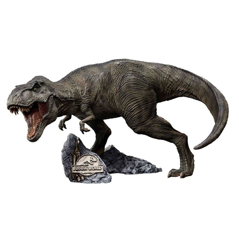 Inardabilmente, il dinosauro più famoso del mondo, originario del Nord America, non c'è un dinosauro più iconico di Tyrannosaurus, o semplicemente T-Rex. La "Tyrant Lizard" divenne il simbolo del franchise di Jurassic Park, presente in tutti i loghi, e avendo un'apparizione memorabile in ogni film. T-Rex è il più grande carnivoro che viveva a Isla Nublar e, come tale, è cresciuto per diventare una bestia senza paura, audace e prepotente, che percorre il confine tra essere un eroe e un cattivo. È ampiamente motivato da due obiettivi: tenere gli intrusi fuori dal suo territorio e mangiare qualsiasi intercettazione che trova. Conosciuto per aver partecipato a molti incidenti e per aver salvato i principali partecipanti umani circondati da altre creature pericolose, sebbene inavvertitamente, interpretando il ruolo di una sorta di antieroe nei film. Iron Studios presenta con orgoglio la loro nuova statua "T -Rex - Jurassic World - Icone"