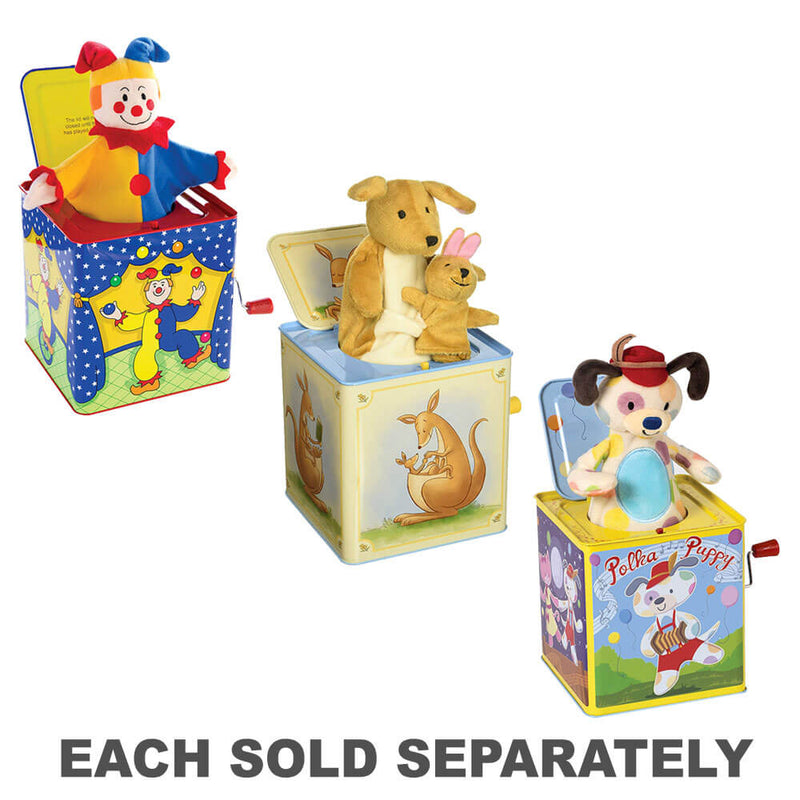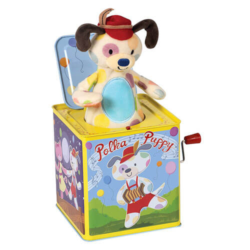 Il Polka Puppy Jack in the Box è un giocattolo unico di Schylling Toys, il leader mondiale nei giocattoli tradizionali e nel divertimento classico. Il cucciolo di Polka sembra un normale jack nella scatola, ma nascosto all'interno è un segreto. Girare la maniglia e ascoltare "Pop va la donnola" fino a quando il cucciolo non si alza. Ma poi, continua a girare la maniglia e balla alla musica! È una deliziosa sorpresa. Per il bambino che può essere sorpreso dal pop, il cucciolo può ballare dalla posizione aperta, eliminando qualsiasi potenziale paura. Il cucciolo polka è decorato in modo da decorare in una scatola di latta in rilievo con deliziose illustrazioni.