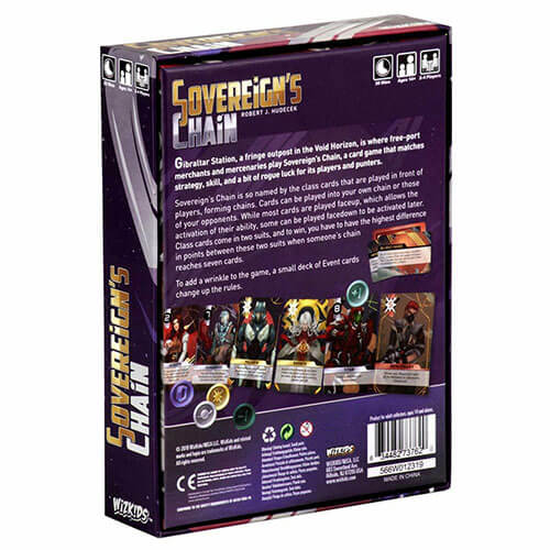 Sovereigns Chain, un gioco strategico e spietato, è così nominato a causa delle carte di classe giocate di fronte ai giocatori, formando catene. Puoi giocare a carte sulla tua catena o quelle dei tuoi avversari. Le carte di classe sono disponibili in due semi, stelle e pianeti e, per vincere, devi avere la più alta differenza nei punti tra questi due semi quando la catena di qualcuno raggiunge sette carte. Per aggiungere una ruga al gioco, è incluso un piccolo mazzo di carte di eventi, con effetti unici che cambiano completamente il gioco.