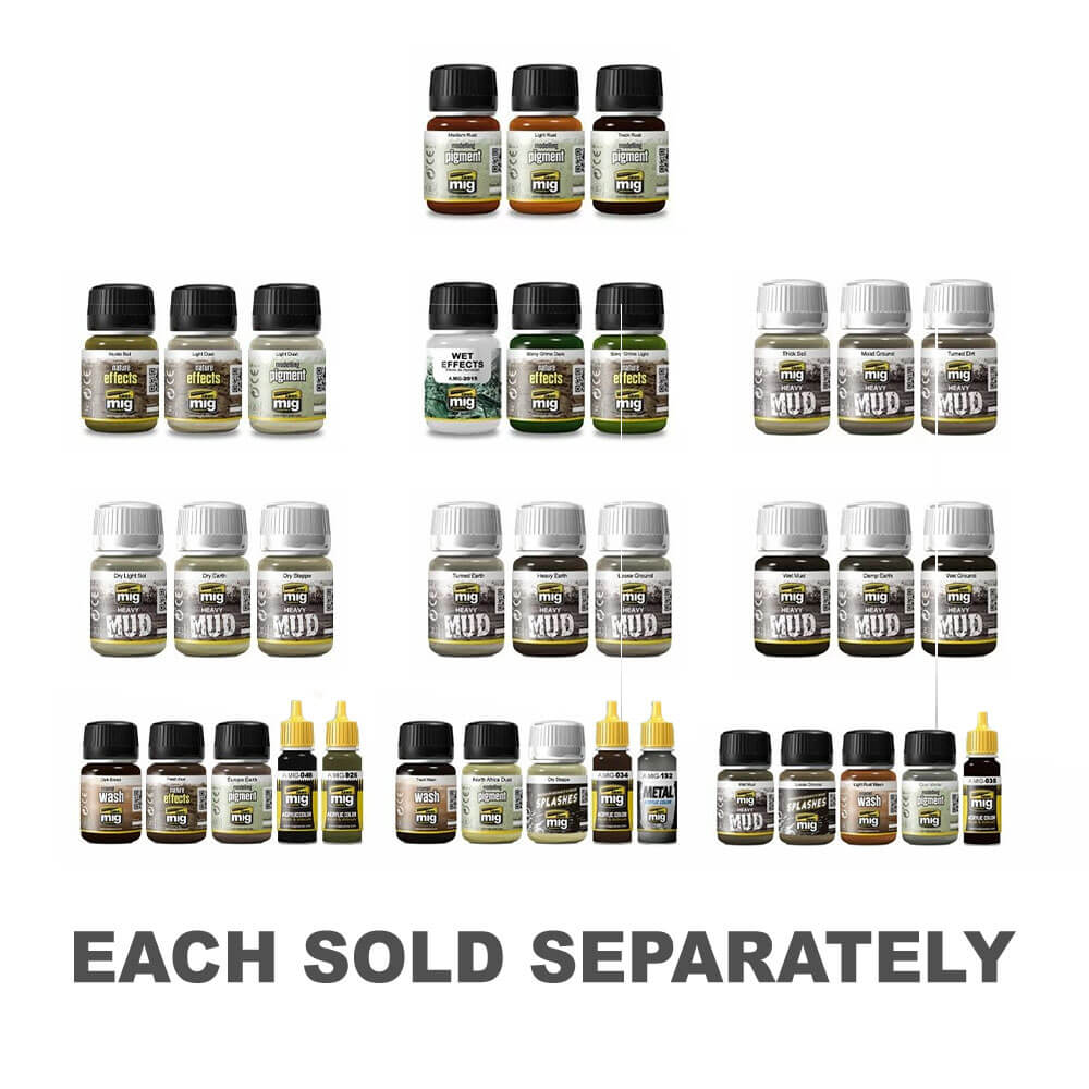 Collezione essenziale di prodotti come trame di terra, colori corretti per le tracce, nonché effetti di ruggine e polvere per le tracce di pittura in tutti gli ambienti aridi. Crea l'aspetto unico di accumuli di polvere e indossare unici per gli AFV in terreno arido secco. Tali condizioni dure e abrasive creano effetti di ruggine secca (A.Mig-1002), collegamenti in metallo lucido (A.Mig-034, A.Mig-192) e accumulo di polvere e terra polverizzata (A.Mig-1751, A.MIG-3003) solo con questo set di tracce di terra a secco multimediale all-inclusive. Il set include 3 barattoli di smalto 35ml e 2 barattoli acrilici 17ml: