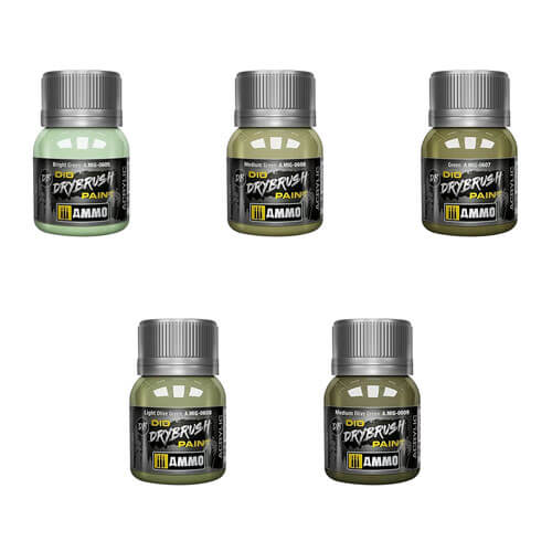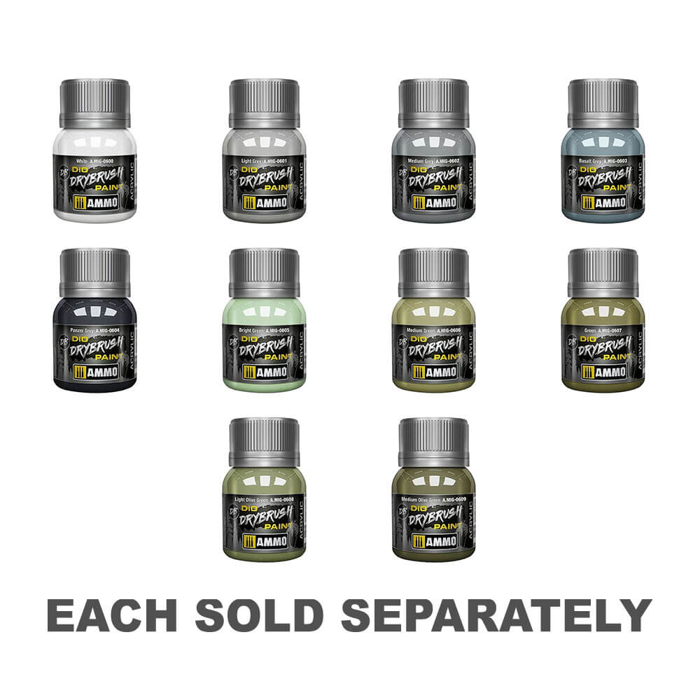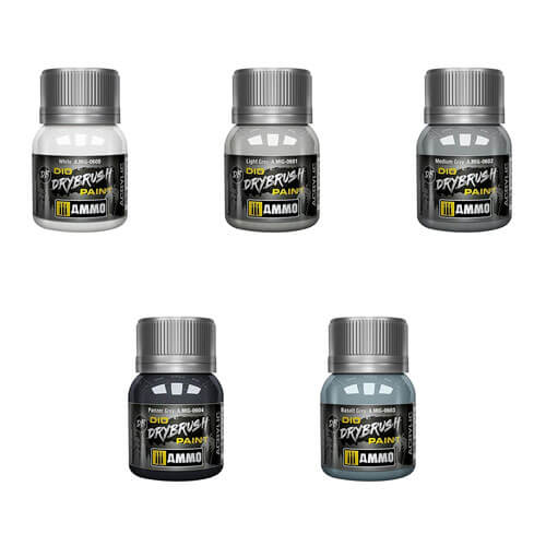Le munizioni hanno progettato una nuova formula di vernice specificamente per il brobosh a secco con la densità ideale e le caratteristiche specifiche che la rendono il miglior tipo di vernice per questa tecnica. Il nuovo pennello Dio Dry è la soluzione perfetta per tutti quei modellisti che amano questa tecnica iconica, probabilmente una delle tecniche di agenti atmosferici più semplici ed efficaci. Basta usare un pennello di qualsiasi dimensione, caricarlo con vernice, asciugarlo al tatto sfregandolo su un pezzo di tovagliolo di carta o un panno per rimuovere l'eccesso, quindi applicarlo strofinando delicatamente sui dettagli del modello per creare una consistenza liscia e uniforme.
