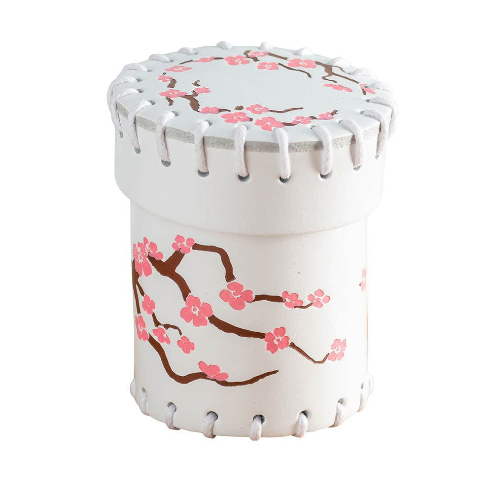 Quell'esperienza ci ha ispirato a creare questa tazza di dadi in pelle giapponese. L'abbiamo realizzato in pelle naturale in colore bianco e adornato il coperchio e il corpo con una stampa colorata; Mostra un ramo di ciliegio marrone mentre sta iniziando a prendere vita con fiori rosa!