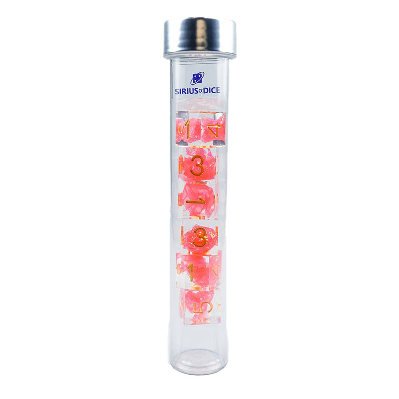 Attacca i tiri con questi bellissimi dadi D6 a spigoli affilati. Sei (6) dadi flamingo taglienti D6 in un tubo a fondo piatto. I dadi sono chiari e presentano una palla vorticosa rosa e oro al centro.
