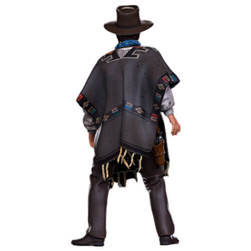 Con la mano destra accanto al suo corpo, pronto come se stesse per tirare una pistola per un duello, il giovane avventuriero dell'anno del 1985 si presenta con il suo corpo coperto da un rustico poncho marrone con ornamenti tribali sui suoi vestiti da cowboy, Un fazzoletto blu sul collo e un tipico cappello sulla testa.