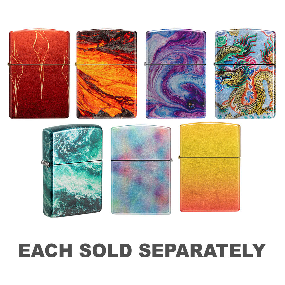 Zippo Dragon 540 Fusion Design Accendino è realizzato con tutte le costruzioni in metallo, il design del vento funziona praticamente ovunque. Una evoluzione totalmente nuova di due dei nostri metodi di impronta più ricercati. Elementi metallici luccicanti ed eleganti palette di colori traslucide, il segno distintivo del processo di fusione uniscono le forze con la tecnologia di colore 540 proprietaria per avvolgere l'accendino su tutti i lati per un risultato finale senza soluzione di continuità, iridescente e assolutamente sorprendente. Questo vivido design del drago si turbina in cima a uno sfondo geometrico rosso ed è integrato dal logo lungo un lato.